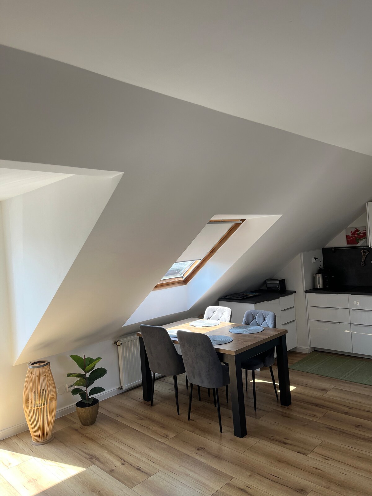 Apartament jest przestronny, urządzony w jasnych, przytulnych tonach, nawiązujących do nadmorskiego klimatu. Na gości czeka dobrze wyposażony aneks kuchenny, idealny do przygotowywania posiłków, strefa wypoczynkowa oraz balkon, na którym można wypić poranną kawę, podziwiając okolicę. Dodatkowo w obiekcie dostępne są udogodnienia, takie jak miejsce parkingowe i bezpłatne Wi-Fi, które sprawiają, że pobyt jest wygodny zarówno dla rodzin z dziećmi, jak i par szukających romantycznego wypoczynku.