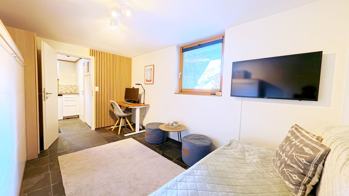 Estudio moderno de 30 m2 con aparcamiento subterráneo privado. Reformado en 2020 y excepcionalmente ubicado en el corazón de Verbier. A 100 metros del ascensor de Medran y a 5 minutos a pie de la plaza central y de la mayoría de los bares y restaurantes. - 1 cama doble grande con colchón Simba Hybrid Pro. - Sofá para relajarse. - Wifi (50 Mbps). - TV Swisscom (más de 1500 canales). - Aparcamiento privado subterráneo. - Balcón con vistas a la montaña, perfecto para explorar. - Cocina totalmente equipada. - Armario de esquí privado. - Caja de llaves para el registro de entrada.