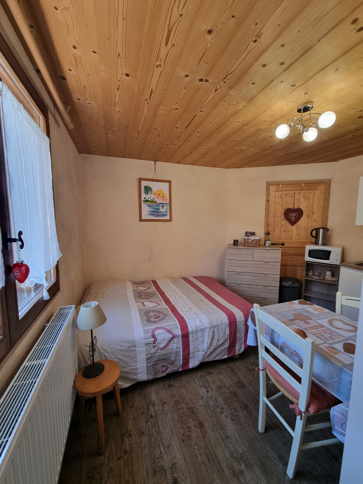 Nuestro estudio se encuentra en un chalet. La superficie (excluyendo el baño) es de 11 m2 con una altura de + 1,80 m + 16 m2 de superficie adicional con una altura de menos de 1,80 m Sala de estar: 2 camas individuales, 1 cama doble, 1 ventana francesa + balcón con orientación sur y vistas a la cordillera de Aravis y al pueblo. Cocina equipada con estufa eléctrica y horno, microondas, hervidor de agua y cafetera tipo «Senseo». TV, wifi. Se admiten mascotas pequeñas previo acuerdo.