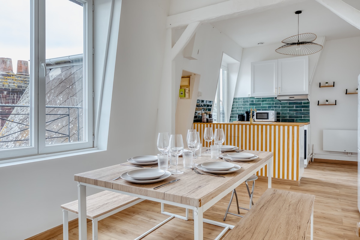 ¡Dúplex situado en el centro, en el barrio del Palacio de Justicia, en el último piso con vigas a la vista, acogedor y cómodo! Se encuentra en una calle peatonal tranquila y soleada. A menos de 10 minutos de la estación de tren, al pie de la rue du Gros Horloge. El apartamento está situado en el último piso de un edificio antiguo (sin ascensor). La habitación es dúplex. Alojamiento ecorresponsable con prácticas ecológicas: productos de limpieza ecológicos, contenedor de reciclaje, bolsa para hacer la compra...