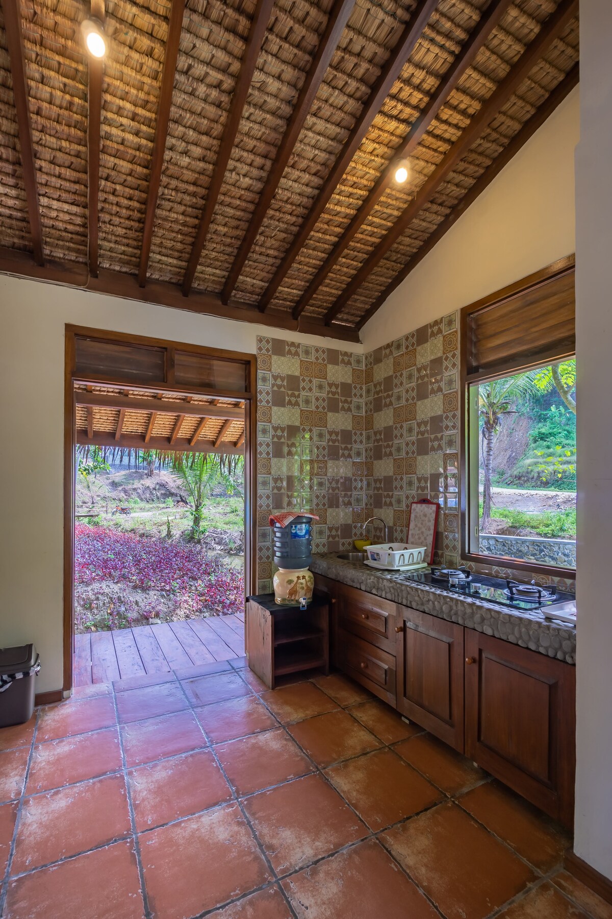 La villa te ofrece no solo alta privacidad y comodidad con buena calidad de servicio, sino también paisajes increíbles. Situada en la ladera de una zona de geoparques que se dirige a la bahía de Pelabuhan Ratu., la villa está a solo 100 metros sobre el mar y tiene acceso directo a la playa. Puedes ver el hermoso horizonte desde la terraza cuando el mar brilla junto a las lámparas de los barcos flotantes de los pescadores por la noche. Te dará un ambiente acogedor, una sensación de relajación y una mente tranquila.
