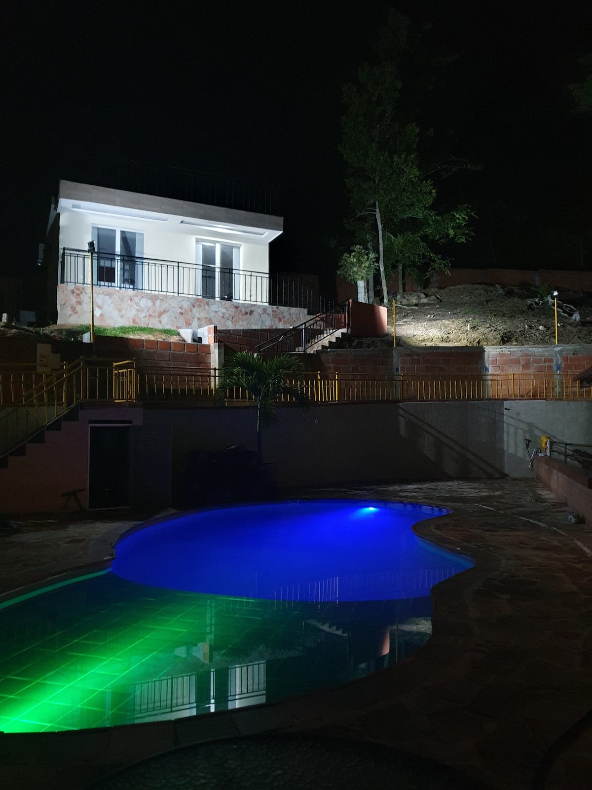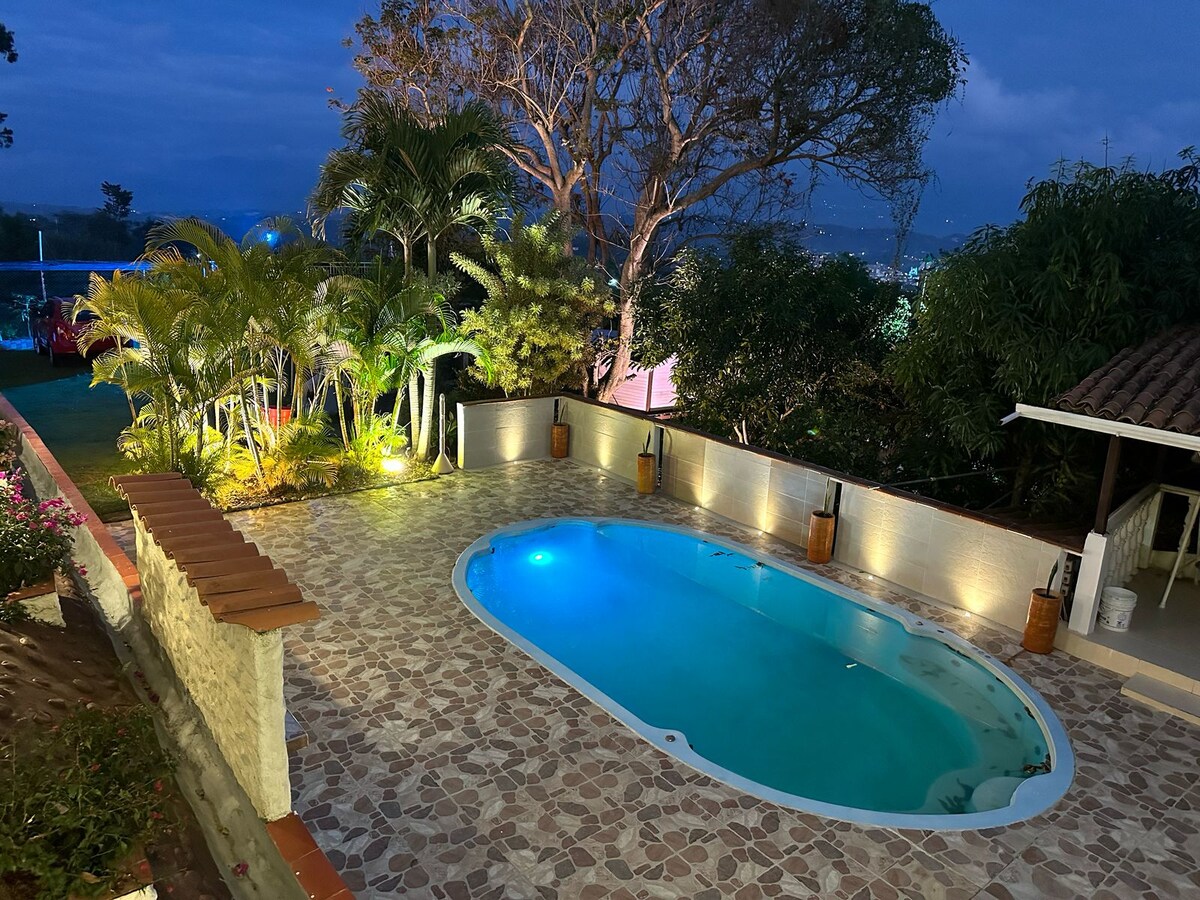 Gran Casa & Chalet segura, tranquila, con amplios jardines, vista al campo y atardeceres espectaculares. Cuatro habitaciones con baño privado y ventilador, chalet doble piso con A/C, baño y ventilador. Piscinas para adultos y niños, tobogán, BBQ, cancha de vóley/fútbol, mesa de juegos, hamacas, fogata y avistamiento de aves. Gran cocina equipada, comedor, sala con TV Smart 65” y sonido envolvente. WiFi y parking privado. A 25 km de Bucaramanga, 3 km del aeropuerto y a 50 km embalse de Topocoro.