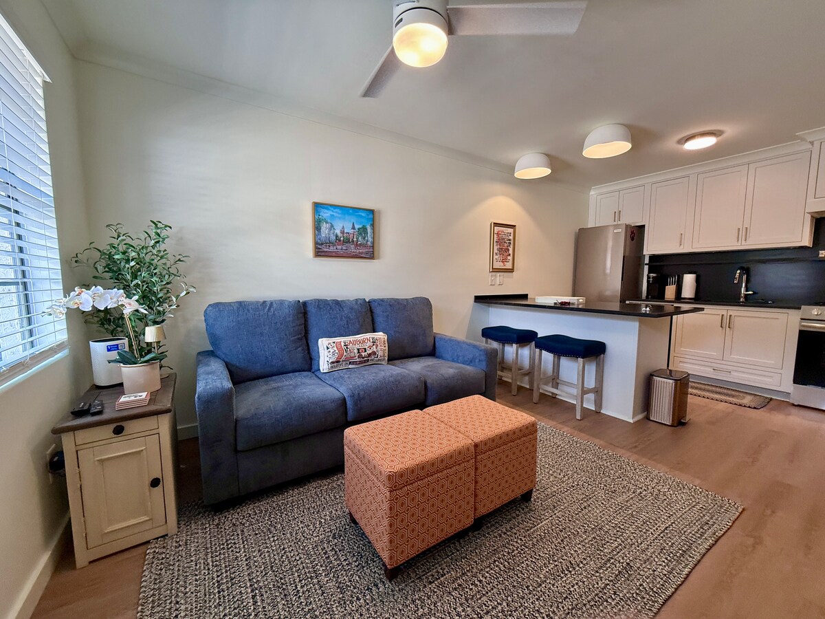 Alójate a unos pasos del campus en este encantador estudio de 300 pies cuadrados, a 10 minutos a pie de Jordan-Hare y a 7 minutos de Toomer's Corner. Totalmente renovado con cocina moderna, Keurig, cama Murphy, baño estilo spa y TV inteligente de 42". Disfruta del café de la mañana o de las bebidas después del partido en tu patio privado. Incluye 1 pase de aparcamiento y entrada fácil con teclado. ¡Ideal para fines de semana de fútbol, visitas al campus o una acogedora escapada a Auburn!