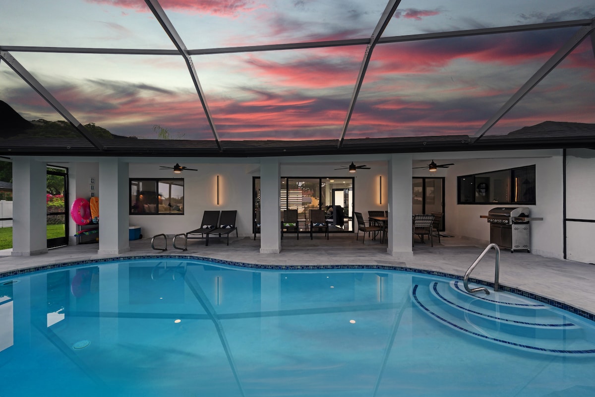 This spectacular 2358 sq. ft. Cape Coral waterfront home will exceed your expectations with its luxurious updates and abundant amenities. Located in a quiet neighborhood, but within minutes to shopping, grocery, restaurants, and beaches! Enjoy a large lanai with a heated pool and spa, outside TV and built-in grill. Includes kayaks, fishing poles, beach items, stroller, private driveway parking, Wi-Fi and printer. Gulf access with boat dock.