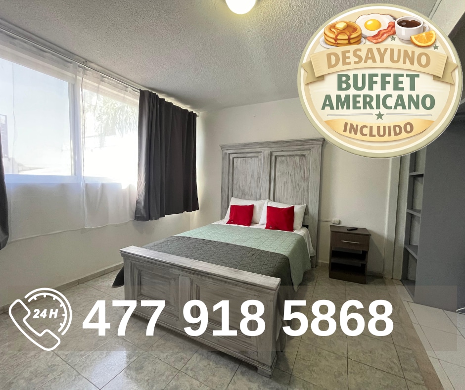Disfruta de tu propio rincón privado en el corazón de León. Esta suite destaca por su terraza exclusiva, un espacio acogedor y tranquilo diseñado para relajarte al aire libre después de un día de compras o trabajo. • El Espacio: 2 camas Queen y mobiliario cómodo. • Terraza: Ideal para un café con total privacidad. • Seguridad: Estacionamiento cerrado visible desde tu suite. Plus: Baño impecable (presión y temperatura garantizada) y acceso a cocina equipada por piso.