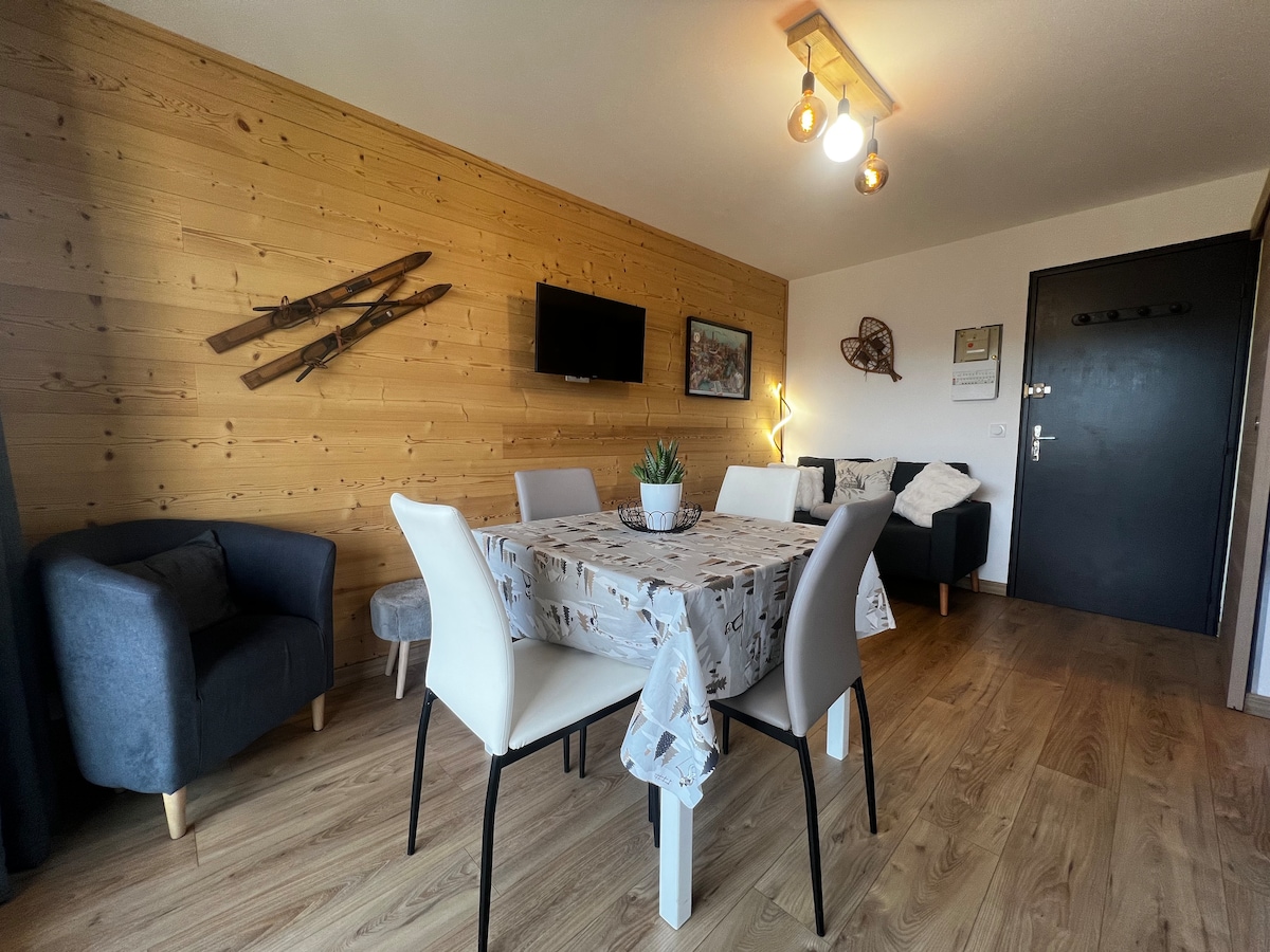 Apartamento ubicado en una estación familiar a 50 m de las pistas, al lado del bosque y frente a un jardín de infantes Ascensor y estacionamiento frente a la vivienda Apartamento cabina que incluye: Una entrada con armario, un baño con cabina de ducha, inodoro y lavadora.una cocina equipada con lavavajillas, una zona de estar con TV y un sofá cama para 2 personas, una zona con 2 literas una plaza y cómoda. armario para esquís en la entrada del edificio