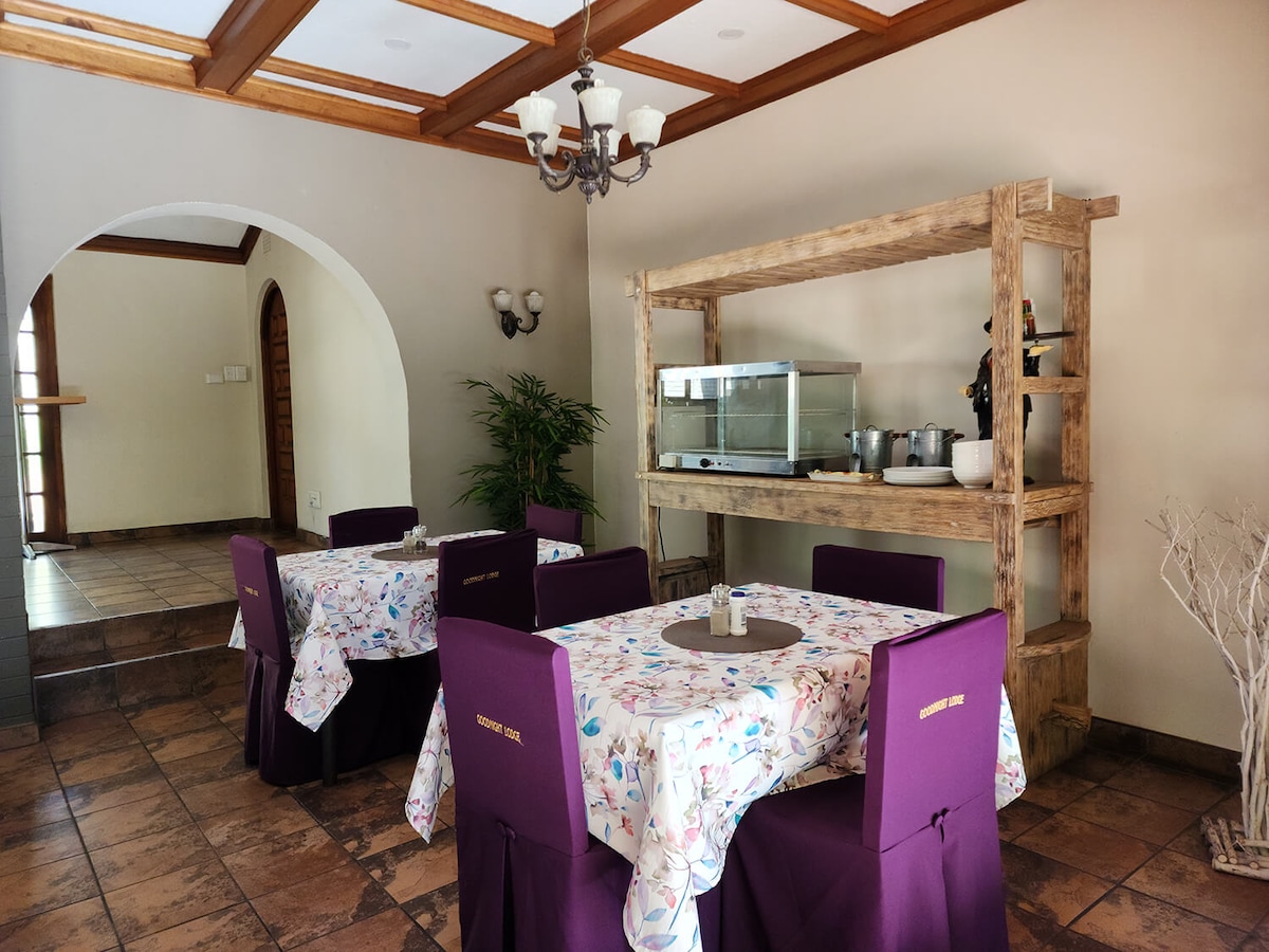 Tenemos la opción de habitaciones Queen o Twin Lux: Suite Queen Lux: cama tamaño queen con baño privado. Suite Twin Lux: dos camas de 3/4 tamaño una junto a la otra con baño privado. Todas las habitaciones tienen: * WIFI gratuito * Minibar nevera * Té/cafetera * Microondas * Televisión con dstv * Escritorio de trabajo * Ventilador de techo o aire acondicionado (por favor, indica tus preferencias) * Calentadores * Caja fuerte digital * La tarifa diaria de las habitaciones incluye * desayuno inglés y continental