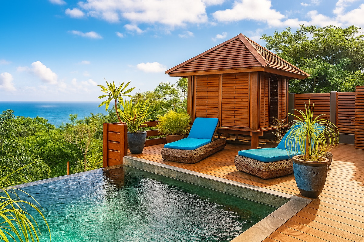 Piscina climatizada, spa y vistas al mar, cabaña Hibiscus