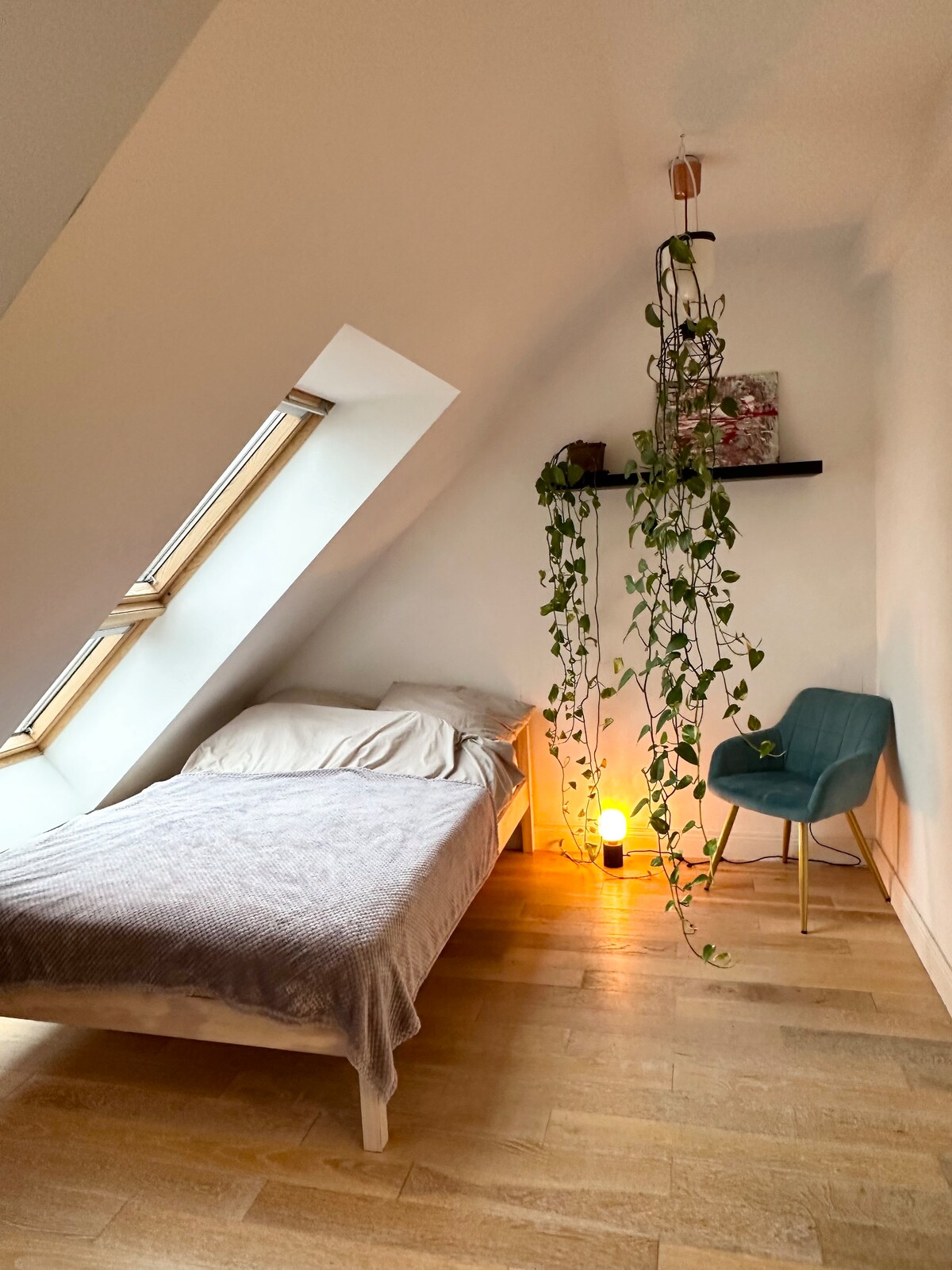 Siéntate y relájate en este tranquilo y elegante alojamiento bajo el techo. Recupera fuerzas y encuéntrate a ti mismo durante un tiempo de descanso. Disfruta de un paseo por el bosque adyacente o por el lago Müggelsee de Berlín, a solo 4 km de distancia. Distancias: 5 minutos a pie hasta el tranvía, 10 minutos hasta el S-Bahn Berlín-Friedrichshagen, 30 minutos en coche hasta Berlín-Mitte, 1 minuto hasta el bosque, 5 minutos hasta la panadería y la fábrica de helados orgánicos