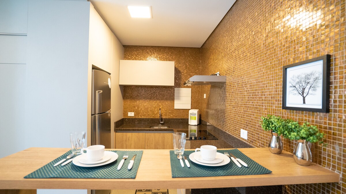 Precioso apartamento situado en pleno centro de la ciudad. Cerca del bohemio barrio de Batel, esta ubicación cuenta con un montón de tiendas y centros comerciales, como Shopping Crystal y Shopping Pátio Batel, Rua 24 horas. Ideal para dos personas, cuenta con salón comedor, un dormitorio, un baño completo y una cocina totalmente equipada. El espacio también cuenta con: wifi, TV inteligente, aire acondicionado frío y caliente, agua fría y caliente en la cocina y el baño. Proporcionamos ropa de cama y toallas de baño.