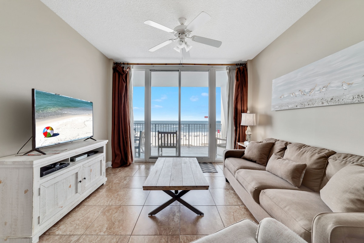 Boardwalk 987 is a beautiful corner unit condo located in the heart of Gulf Shores. Come relax on our deck and watch the dolphins as you drink your coffee in the morning or enjoy happy hour in the evening. The Private balcony has a direct ocean view from the living room and master bedroom. Plenty of room to sleep 6 to 8 with a pull out sofa bed. All 3 bedrooms have a TV plus a 4k Roku flat screen in the living room. We have a fully stocked kitchen with grills in the common area.