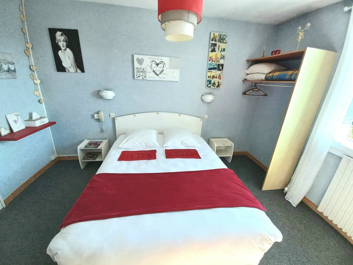 Habitación de huéspedes con aire acondicionado en el centro de la ciudad - Situada en el segundo piso de un pequeño edificio tranquilo (3 apartamentos) - Cerca de todas las tiendas y restaurantes - Para 2 personas - 2 camas de 90*190 - Baño: ducha e inodoro - Set de cortesía (jabón - champú - gel de ducha) - TV HD de 108 cm - WIFI - Caja fuerte - Cafetera y hervidor de agua - Cesta de bienvenida (café - té - tilo - verbena - chocolate - pasteles) - No fumadores - Se admiten mascotas - Aparcamiento gratuito