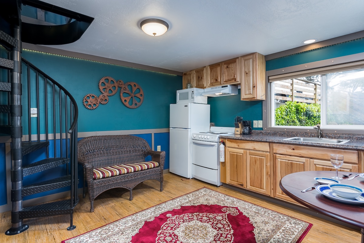 ¡Entra en The Nautilus!, tu acogedor refugio inspirado en los submarinos. Arriba, tu dormitorio y baño dan a una escalera de caracol que baja a una cocina totalmente equipada con estufa eléctrica y horno, microondas, nevera de tamaño completo, tostadora y cafetera. Relájate junto a la chimenea eléctrica, disfruta de una comida en la pequeña mesa del comedor o acurrúcate en el sofá después de un día explorando la costa de Oregón.