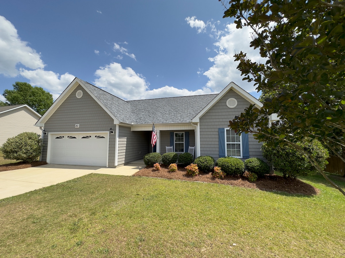 Una moderna casa recién renovada con toques personales en un barrio tranquilo ubicado en Fayetteville. Es ideal para salir a caminar o a correr. A unos 5 minutos de Ft Bragg, a 10 minutos de Raeford, a 25 minutos de la I95 y a 25 minutos del aeropuerto. La casa tiene tres dormitorios, todos con camas tamaño queen. La cocina está totalmente equipada para las personas que quieran cocinar. La sala de estar está equipada con un televisor y un roku. Hay lavadora y secadora disponibles para su uso en el garaje.