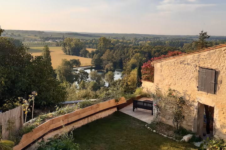 Ubicada en uno de los pueblos más bellos de Charente, esta auténtica chabourne totalmente renovada ofrece una vista panorámica del valle de Charente y del río, que se puede contemplar desde la terraza. Ruta de senderismo, ciclismo de flujo, zonas de baño cercanas y guinguettes... ¡En verano, nuestro pueblo es un paraíso! La estufa de leña y la sauna, un verdadero refugio, aportan al lugar un ambiente cálido y relajante. La ropa de cama es nueva y muy cómoda.