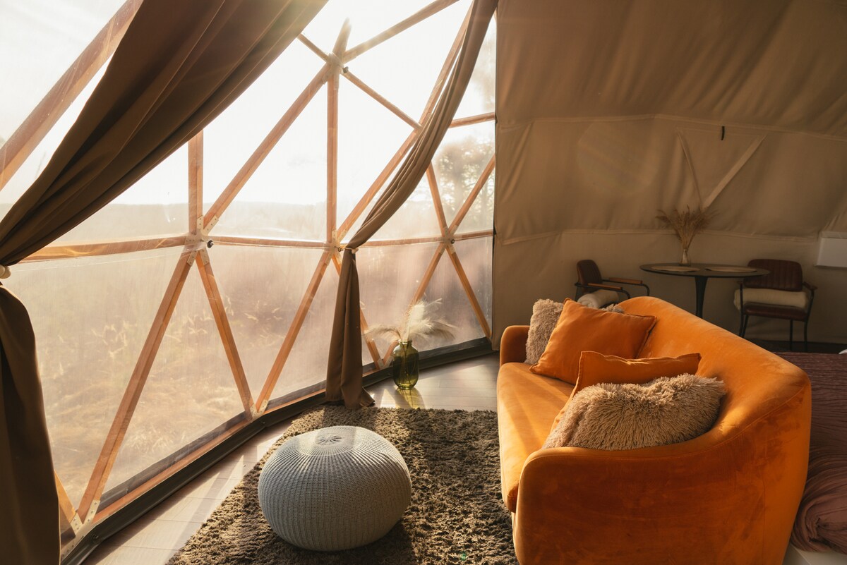 Una cúpula de pie en un lugar tranquilo, noches se pueden ver las estrellas, relámpagos. Hay un estanque, una playa y un bosque justo al lado. Un inodoro bio situado cerca para una cúpula. La cúpula está equipada con aire acondicionado que se congela y se calienta, también hay una mininevera, un altavoz, un proyector y una pantalla para películas. La lámpara LED puede brillar en diferentes colores. Disponible para 2 personas, 2 camas dobles con dormitorios.