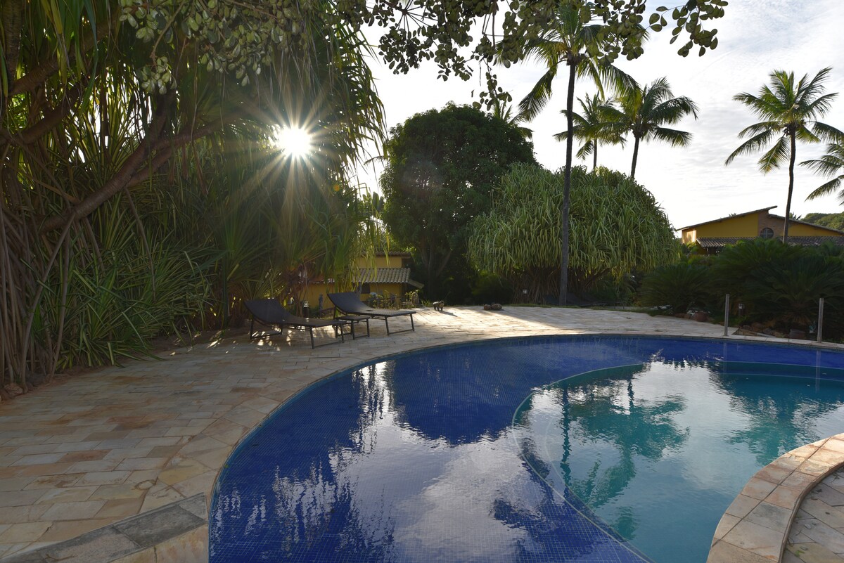 Chalet en Praia de Pipa con piscina privada, todo con aire acondicionado, 2 suites dobles, TV con acceso a streams, cocina gourmet completa integrada en la zona de la piscina, wifi y garaje para hasta 2 coches Baños con secador de pelo y artículos de baño. Tenemos agua mineral. Ideal: familia que quiere privacidad y tranquilidad. Aproximadamente a 15 minutos a pie (700 m) de Praia do Amor, Chapadão y el centro de la ciudad. A 3 minutos a pie del supermercado, panadería, farmacia, nevera, bares, restaurantes y lavandería para ropa.