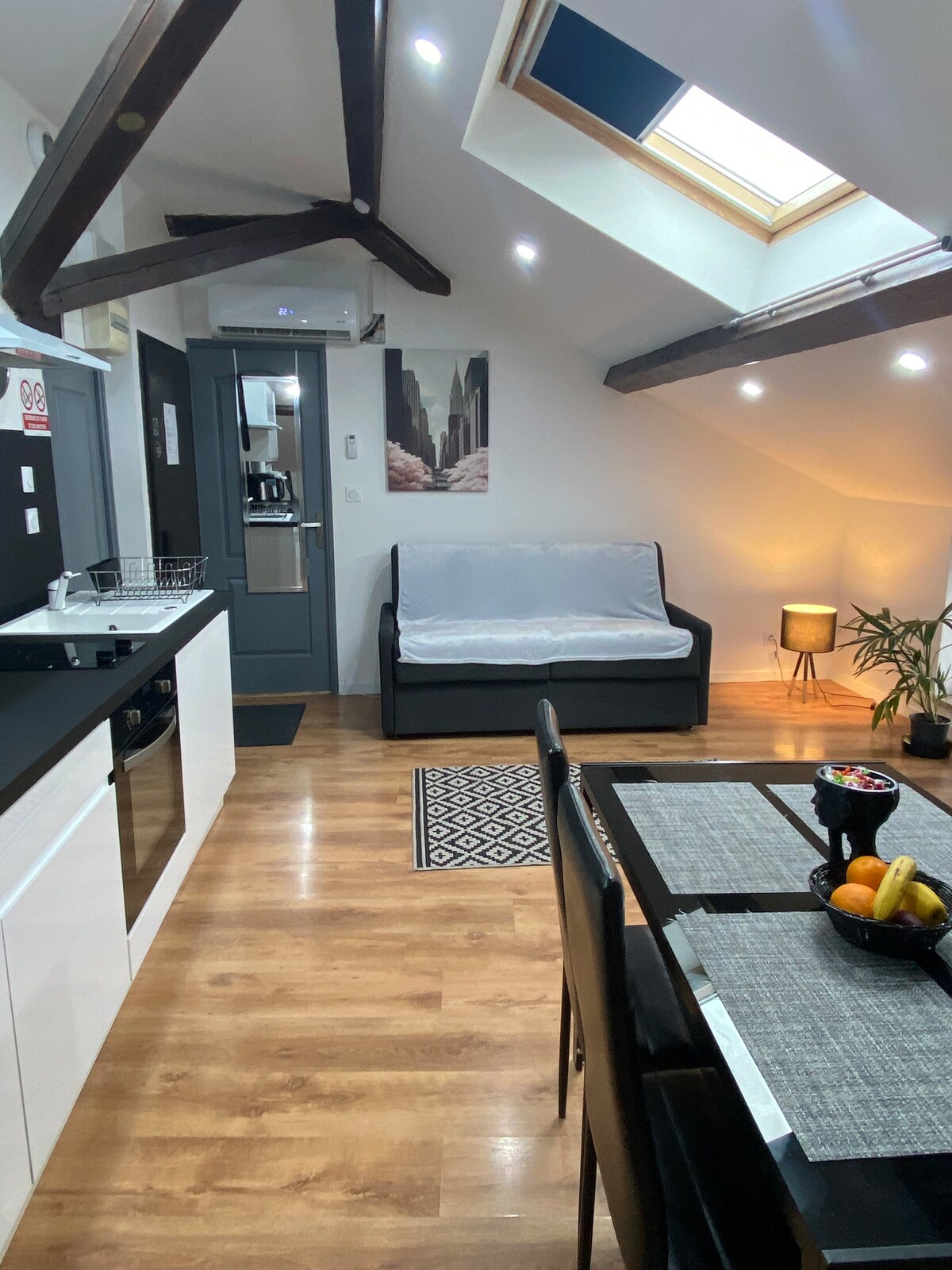 La loge est un appartement penthouse, rooftop aux prestations haut de gamme. Vous pourrez profiter de 60m2 pour 3 personnes maximum (le troisième couchage est un appoint, canapé lit 1 personne de chez Maison du Monde). La loge est la parfaite alliance du confort et de la tradition: charpente apparente, climatisation, fibre optique et bouquet de chaînes TV, cuisine entièrement équipée, décoration choisie, exposition d’œuvres d’art, terrasse, balcon, parking privé en supplément.
