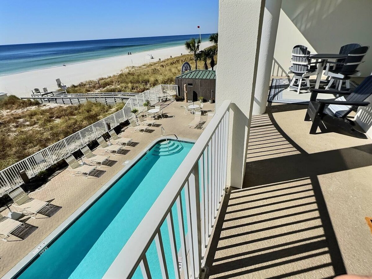 ACCESO DIRECTO A LA PLAYA - VISTAS DESPEJADAS AL GOLFO - TOTALMENTE ABASTECIDO - TOALLAS DE PLAYA Y SILLAS INCLUIDAS - SERVICIO SUPERIOR ¡Bienvenido a «SUNSET VIEW»! Este condominio de 2 dormitorios y 2 baños totalmente renovado tiene una increíble vista directa al golfo desde el gran balcón privado. Amplia planta abierta y equipada con todas las comodidades del hogar. Una vez que llegues a «Sunset View», estarás feliz de relajarte con la mejor vista de PCB. También disfrutarás de acceso directo a la playa, los servicios del centro vacacional y el servicio de asistencia de sillas de playa.