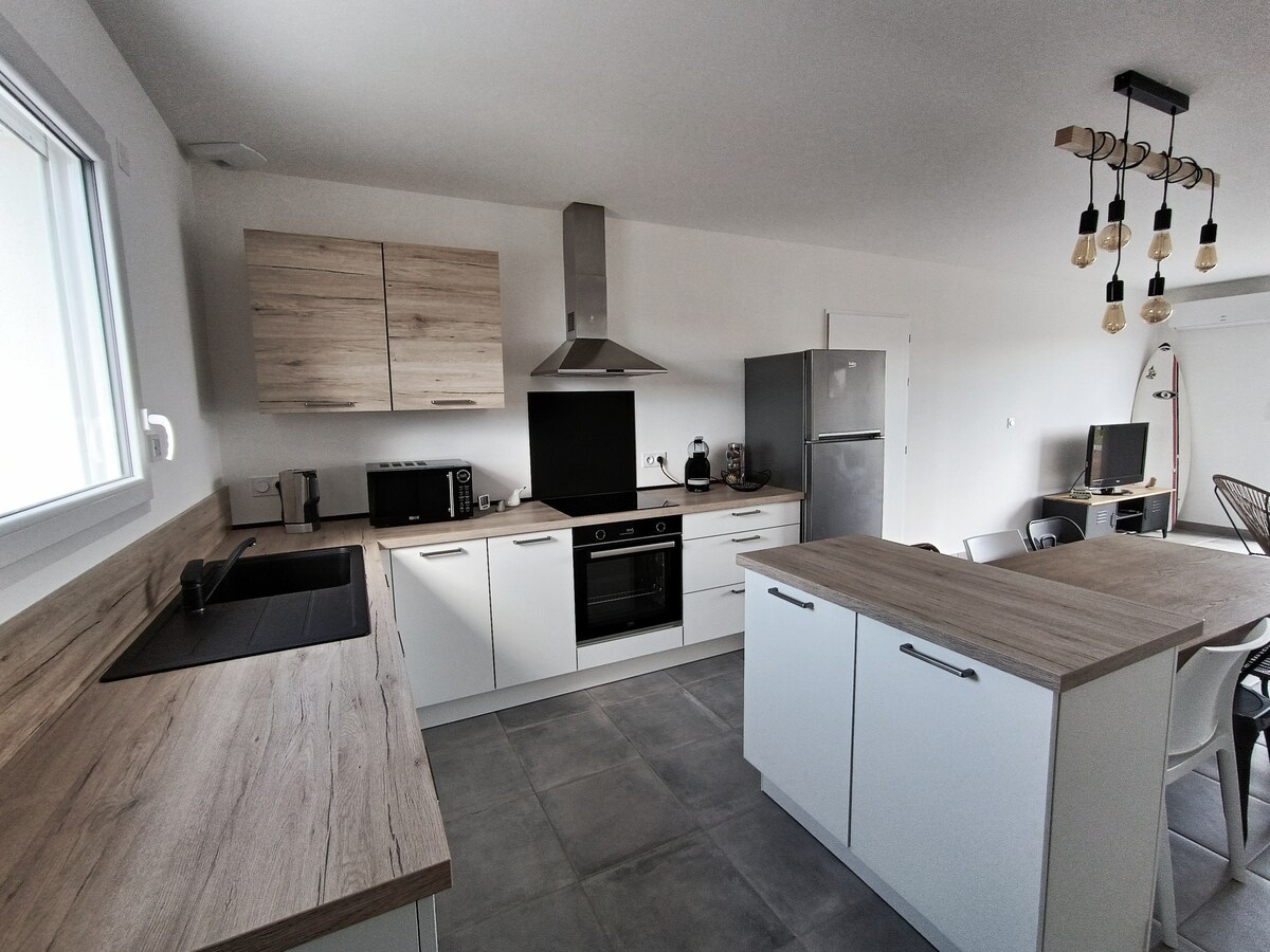 Relájese en este alojamiento tranquilo y elegante. Apartamento T1 totalmente equipado situado en la planta baja de una casa residencial ocupada por una pareja de jubilados jóvenes. Este alojamiento independiente, nuevo, bañado en una zona verde, situado a 10 minutos en bicicleta de las tiendas, a 1500 metros a pie de las playas a través del bosque le seducirá por su tranquilidad. Podrá descubrir el bosque nacional y su recorrido deportivo, tomar los carriles bici del litoral directamente desde el apartamento.