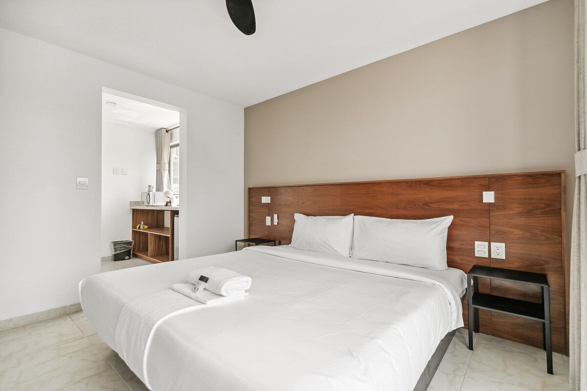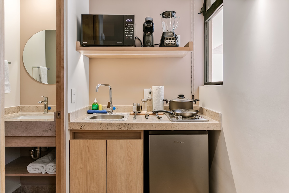 La suite esta equipada para brindar el mayor confort. Descanse en su cama con colchón memory foam mientras ve una película en la smart TV, WIFI alta velocidad. Disfrute de un buen baño en una regadera con acabados de alta calidad. Trabaje sin preocupaciones en el escritorio contamos con wifi de alta velocidad. Prepare comidas en la cocina totalmente equipada, en esta suite tendrá todo lo necesario para una estancia corta o larga.