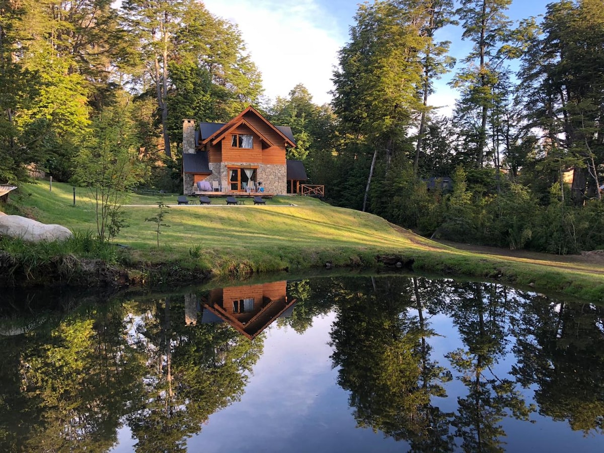 No es una casa cualquiera. De madera de cipres acerrado ahi mismo. Luminosa, amplia, bien aislada para asegurar el mínimo consumo de energía. Decoración de sencilla elegancia acorde al lugar, cuadros de fotos de Florian von der Fecht enmarcados con madera reciclada. sin vecinos, rodeada de bosque, de senderos y acceso privado al arroyo Blanco que limita la propiedad. El murmullo del Arroyo Blanco se interrumpe por el canto del huet-huet.