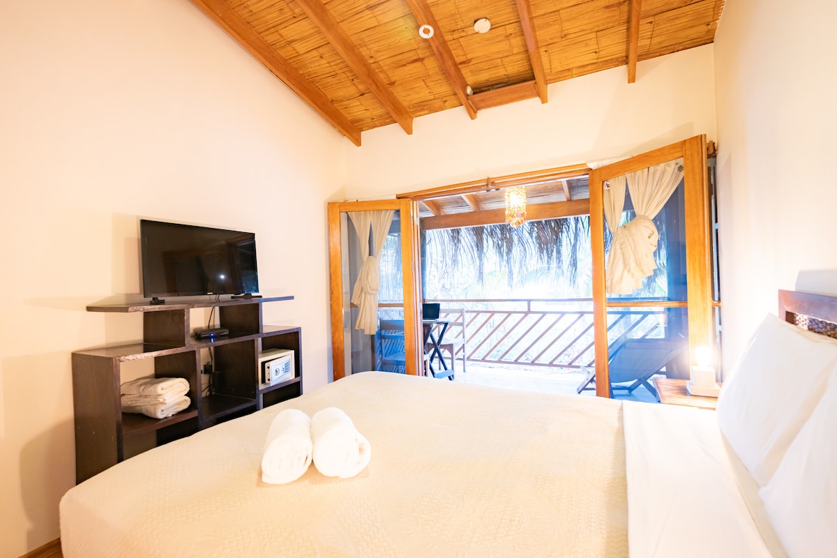 Nuestro Bungalow Queen tiene de una ubicación privilegiada con vista al mar y al jardincito que tiene al frente de su terraza privada. Este espacio rústico y acogedor cuenta con una cama Queen size y ventilador, garantizando una estancia cómoda y relajante con todos los amenities necesarios.
