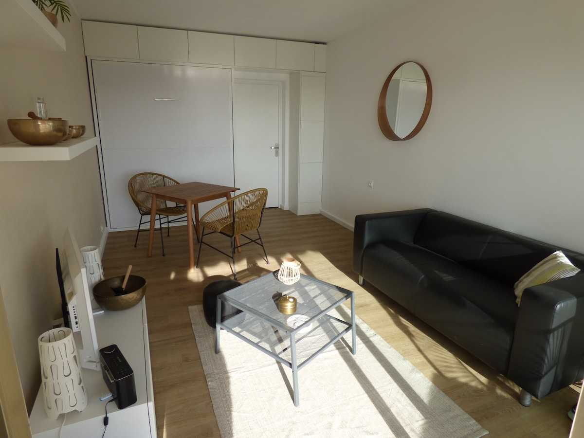 Este apartamento acogedor frente al mar, ideal para parejas, ofrece una vista relajante del mar. El apartamento está a 8 minutos en coche del aeropuerto y a 10 minutos a pie del hipódromo de Cagnes-sur-Mer y de las tiendas de la zona. Combina comodidad y tranquilidad. El luminoso salón tiene un sofá cama de alta gama y un televisor de pantalla plana. La cocina equipada incluye lavavajillas y cafetera Nespresso. No se cobra limpieza.
