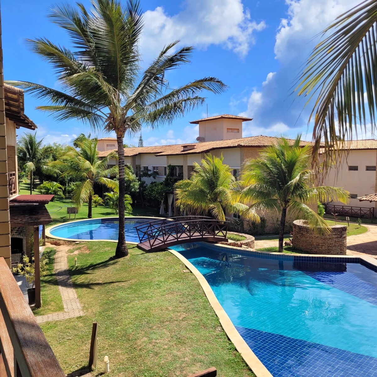Casa grande y cómoda en Pipa, ideal para familias o parejas que buscan tranquilidad. En dos pisos, con 3 dormitorios con aire acondicionado y 3 baños. Tiene unos 200 m² de superficie construida, 45 m² de balcón semicubierto y 50 m² de superficie exterior con dos piscinas integradas y vistas al bosque. Cocina completa, parrilla a gas y dos salas de TV. Garaje para 2 autos (1 cubierto). Tiene capacidad para 6 personas; las habitaciones se preparan de acuerdo con la reserva.