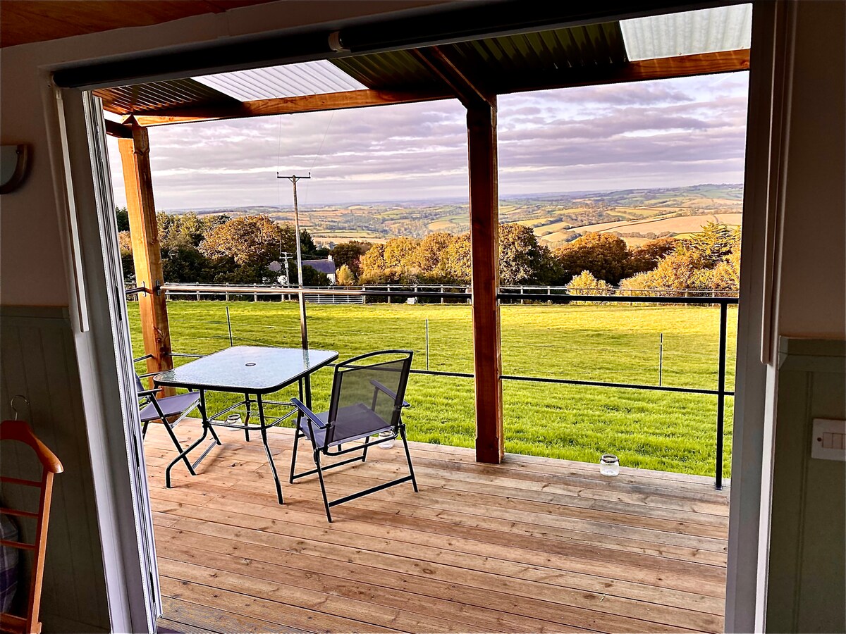 The Hutch Devon - Your home from home in Devon. Rest and recharge. Take in the wonderful views of the surrounding countryside from your own private deck. Sink into the king size bed, soak in the bath, and enjoy a meal for two by the fire or on the deck - depending on the season! Thoughtful extras include: breakfast, Nespresso, Netflix & fluffy bathrobes. 15 min drive to Exeter or Dartmoor. EV charging available. If unavailable, please see The Burrow at the same location with over 100 5* reviews.
