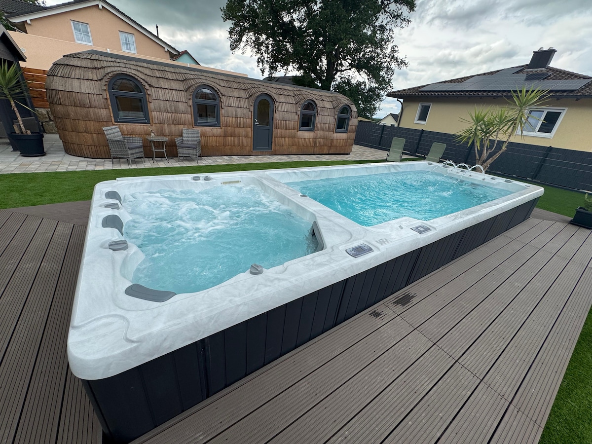 Unsere Franken Chalets in Kist bei Würzburg verbinden Natur, Komfort und Nachhaltigkeit – ideal für Paare und Familien. Direkt vor der Tür starten Wanderwege, drinnen warten Sauna, Whirlpool und Pool. Statt echtem Rasen setzen wir bewusst auf hochwertigen Kunstrasen: kein Wasserverbrauch, kein Lärm, keine Chemie – für mehr Ruhe, Sauberkeit und Raum für echte Natur. Ein stilvoller Rückzugsort das ganze Jahr über.