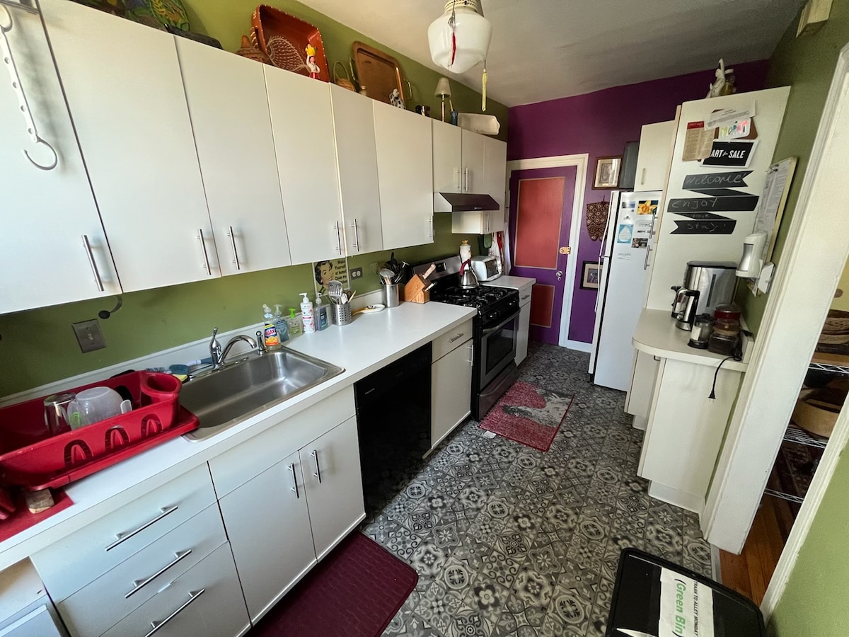 ¡Los artistas y creativos son bienvenidos! Alójate en nuestra casa adosada de 1920 con su mezcla de textiles de la época de los 70 y estilo contemporáneo. Por favor, entra en el pasillo compartido y busca la entrada a tu apartamento a la derecha. Frente al perchero. Moon Base (ment) es el apartamento privado completo de nivel inferior, con cocina totalmente equipada con vitrocerámica, lavavajillas, triturador de basura, cómoda cama doble, baño privado con ducha, lavandería y tu propio patio junto a la cocina y acceso a un pequeño patio con iluminación.