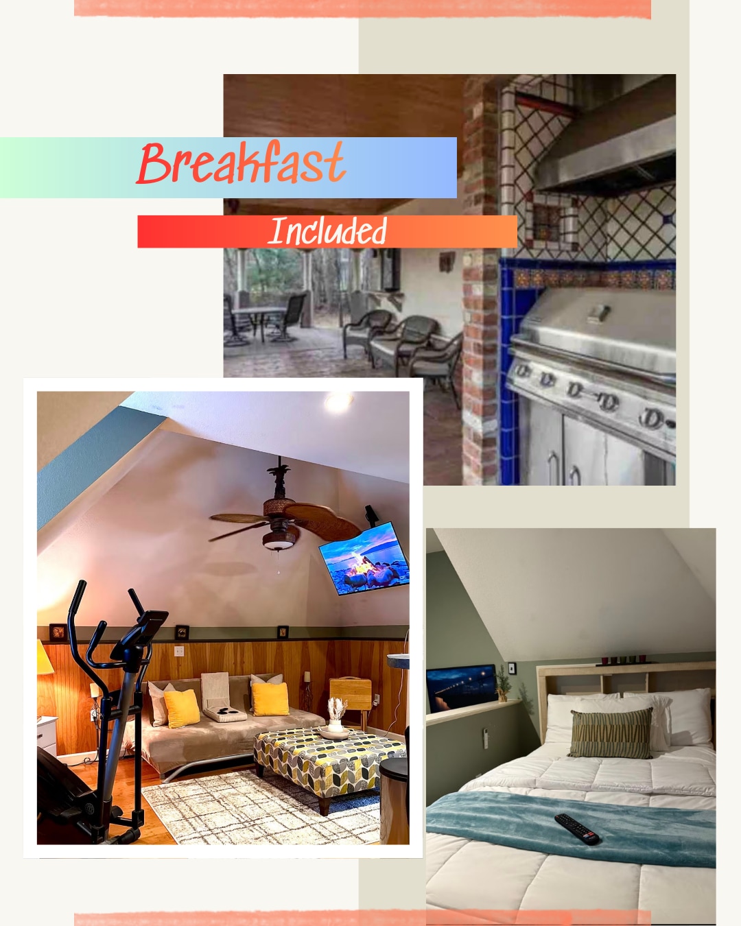 La entrada de la caja de seguridad para llaves al nivel del sótano de entrada completamente privada incluye; sala de estar con sofá, silla, TV de pantalla grande Fire/; WiFi/ chimenea; cama tamaño queen y cofre. (Cama plegable disponible). Una habitación lateral separada incluye una ducha privada, lavabo, zona de comedor con mesa y sillas, nevera, tostadora, microondas y cafetera; (desayuno ligero incluido). El medio baño privado se encuentra en la planta principal en la parte superior de las escaleras dentro del área de entrada. Plaza de aparcamiento privado frente a la casa.