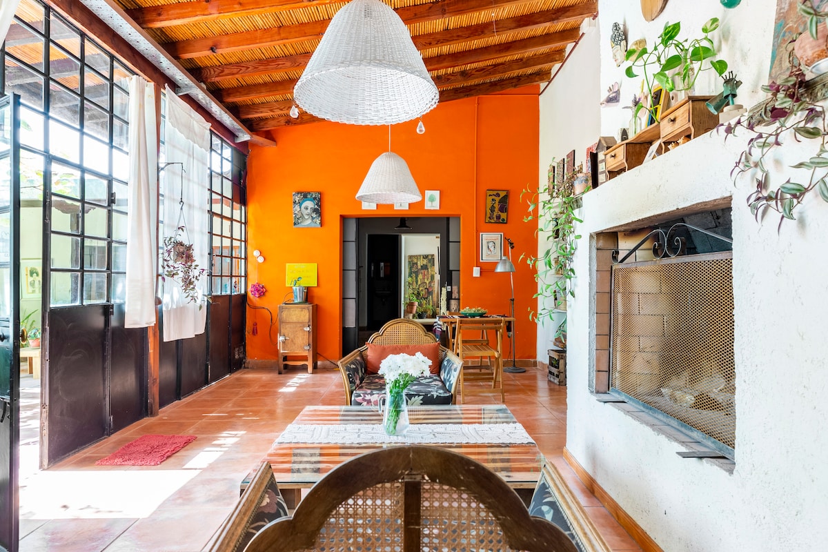 Artista plástica ofrece: loft continuo a su casa con entrada independiente. Rodeado de árboles y un hermoso jardín con pileta. EL LUGAR INCLUYE DESAYUNO: cafe, te, leche, pan, manteca, queso crema, dulce, huevos y frutas de estación. Art teacher offers: Spacious, independent studio apartment, surrounded by trees in middle of a beautiful garden. Includes living room, bedroom and kitchen areas, and separate bathroom. Very luminous, large windows with views of gardens and swimming pool.