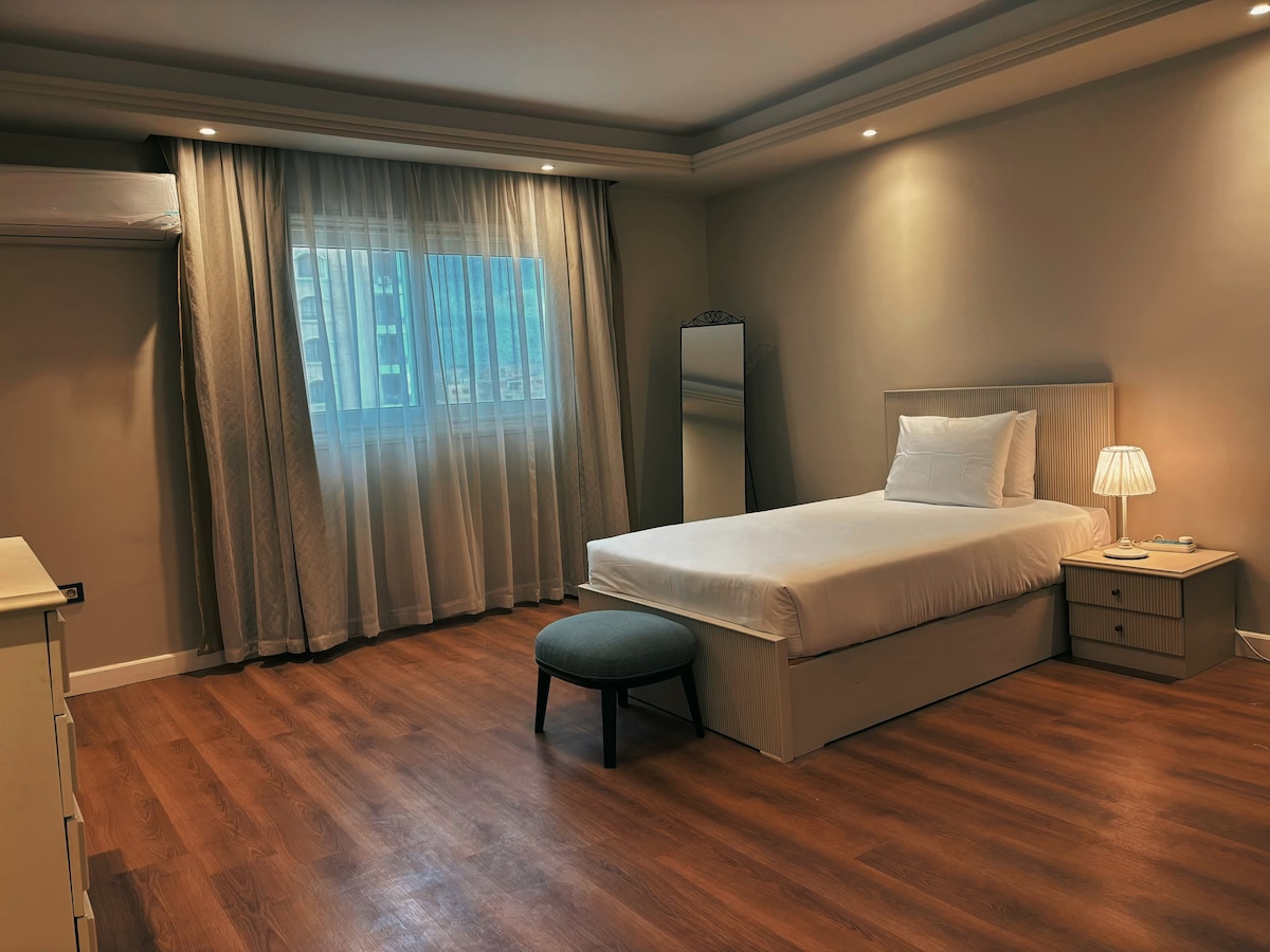 Un lujoso APARTAMENTO ENTERO situado en el CENTRO de todas partes en El Cairo (Maadi ). Las habitaciones están recién amuebladas, tienen aire acondicionado, están bien DISEÑADAS , tienen todos los servicios, están súper LIMPIAS y son TRANQUILAS . El departamento está a diez minutos de la autostrade y A POCA DISTANCIA A PIE de la carretera del río Nilo y de la estación de metro. Cafeterías, restaurantes, supermercados y farmacias están todos cerca. Está a 20 minutos del centro. Calidad estándar del hotel con el hogar como comodidad ofrecida con un PRECIO RAZONABLE.