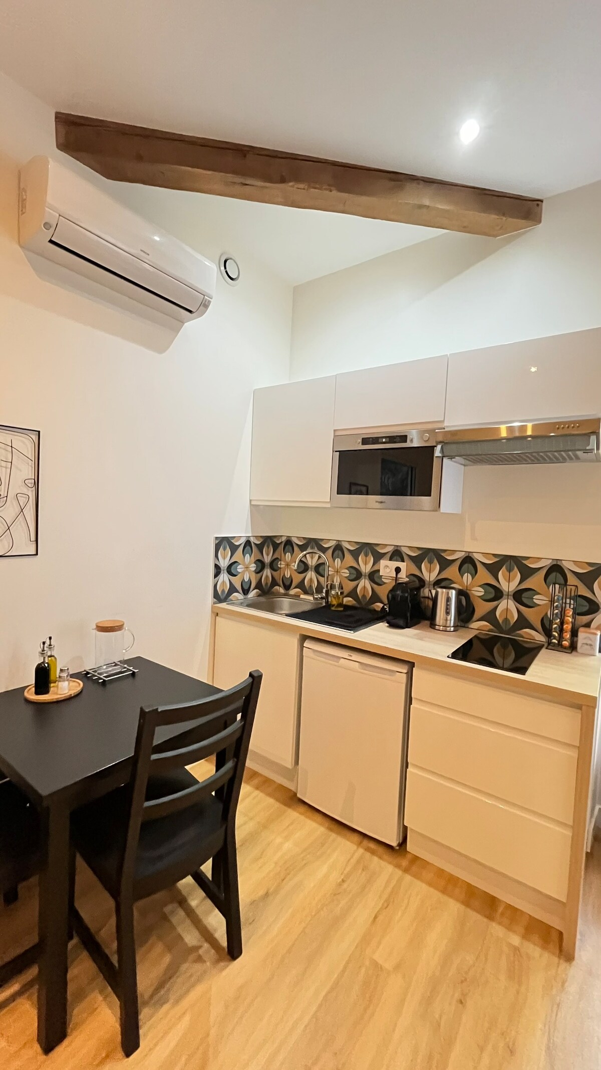Bienvenido a nuestro cálido dúplex de 95 m2 a 2 pasos del centro. 4 habitaciones dobles, 2 de ellas con aire acondicionado, 1 con baño privado con ducha. Un segundo baño disponible. Oficina equipada y Wifi Amplia cocina equipada abierta al luminoso salón-comedor. Una terraza equipada y sombreada está disponible. Estacionamiento cercano con estación de carga.