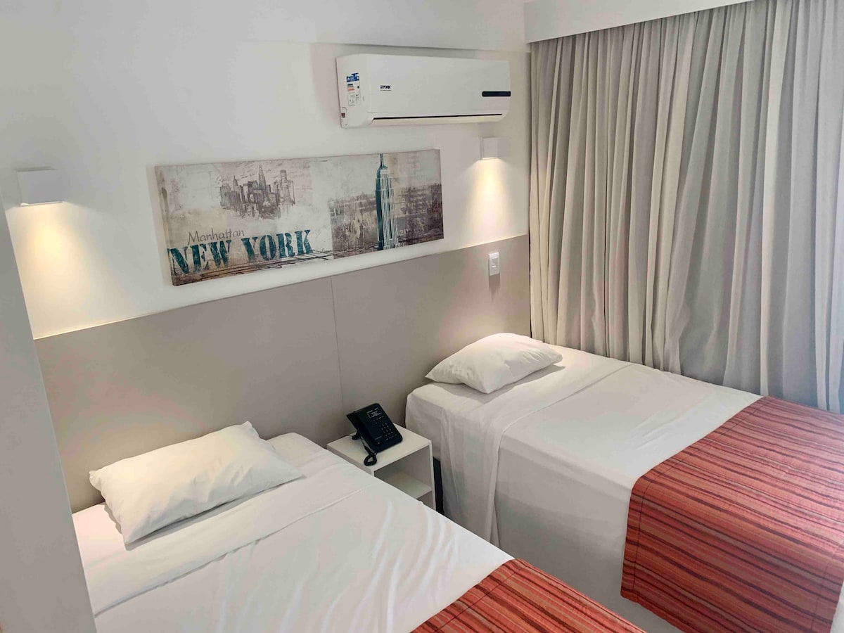 Piso completo con cama tamaño queen y excelente baño, pequeña cocina totalmente equipada, con microondas, cocina eléctrica, licuadora, sandwichera, cafetera, platos, cubiertos y ollas. Ropa de cama y toallas de primera línea, 100% algodón. Edificio con una ubicación excelente, conserje las 24 horas y garaje disponible para 34 coches por orden de llegada. Disfruta de una hermosa piscina después de una sauna. ¿Qué tal?En el edificio también hay un culturismo y una lavandería. ¡Estaré encantado de darte la bienvenida!