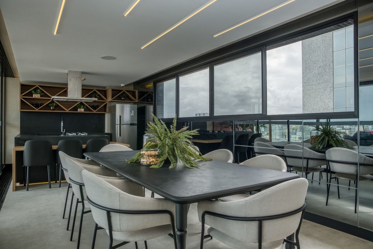 EDIFICIO SKY CONCEPT. Este lugar único tiene su propio estilo. Piso de 1 dormitorio para hasta 6 huéspedes en la mejor ubicación de Jatiúca. Edificio con sistema moderno, ocio completo para atender mejor a nuestros huéspedes. Apartamento súper equipado y completo con todo lo que nuestros visitantes necesitan para una estancia perfecta. Recién lanzado, desayune con vistas al mar y disfrute de un piso decorado y equipado. Disponemos de ropa de cama, toallas, secador y plancha y lavadora.