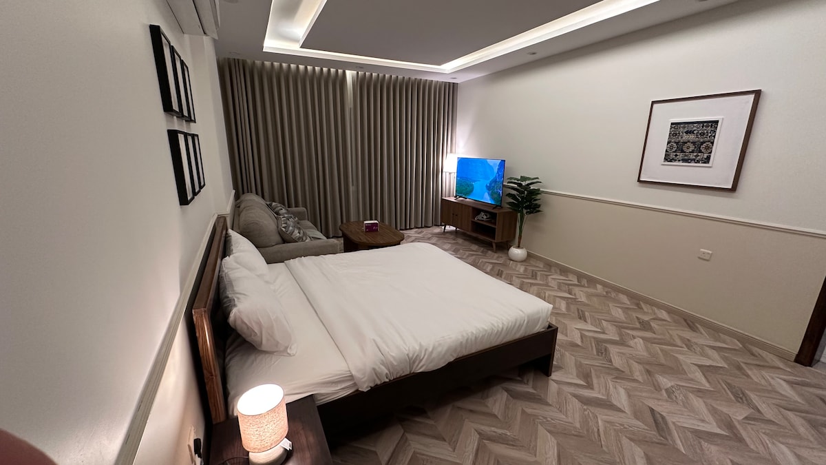 Disfruta de toda la familia en este elegante lugar. Apartamento de lujo moderno * Diseñado y preparado para encontrar tu comodidad * Dos habitaciones ( principal /habitación 3 camas) y un amplio salón abierto a la cocina moderna Diseño elegante (pantalla Samsung Smart WiFi) Cocina totalmente equipada. - Refrigerador. - Horno + microondas + lavadora - Todos los suministros de cocina están completos. - Estufa (a gas / electricidad) Además de la ubicación destacada A 8 minutos en coche de la estación de tren. A 10 minutos en auto del aeropuerto. A 5 minutos en auto de la mezquita de Quba. A 15 minutos en auto de la mezquita del Profeta.