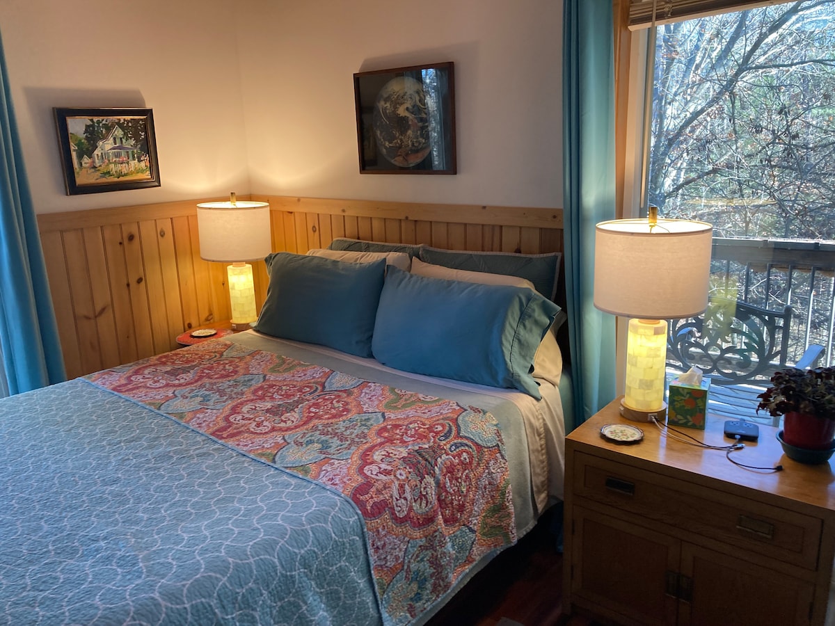 Relájate en tu cómoda suite privada (2.300 pies de altura) en 1,7 acres con vistas a la montaña. Wifi rápido, estudio, dormitorio con escritorio, baño y sala multiusos con cocina completa, comedor interior/exterior, lavadora y secadora. Disfruta de la vista de la montaña más alta al este de la señorita. Río - Mt. Mitchell (6,684 pies). En la naturaleza, pero cerca de aventuras durante todo el año, como senderismo, esquí, rafting, tirolinas y más. Esta es una escapada tranquila a 1 milla de Mars Hill Univ, restaurantes, tiendas de comestibles y a 20 minutos de Asheville