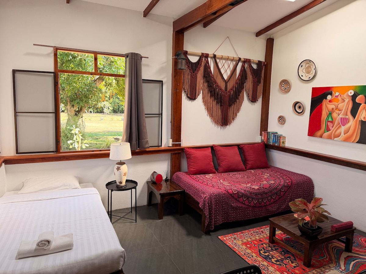 This is a peaceful 1-bedroom retreat with private bathroom and air conditioning, tucked away in a quiet corner of our garden. Just a short distance from the heart of Pai, it’s perfect for exploring the town while enjoying a calm digital detox. No notifications, no rush — just birds, trees, and pure relaxation. While WiFi is available in the common areas, we invite you to disconnect & fully immerse yourself in nature, letting the surroundings inspire connection & calm. 🌿