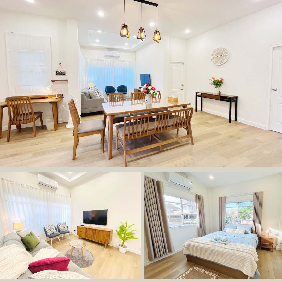 🏡 Fully equipped & furnished/ 3 bedrooms /3 baths ( with water heaters )/ 2-3 cars parking on premises / max. 6 guests 🚫🚬 🛌Room1: 1 king bed + attached bathroom 🛌Room2: 1 queen bed 🛌Room3: 1 king bed ✅TV ✅internet ✅kitchen supplies ✅ Electric stove ✅Microwave ✅fridge ✅washing machine ❌ no dryer 🚙 500 m. to 7-11, Lotus, shops 🚙 3 km. to KKU, Sri Nakarind 🏥, Lotus Extra, Makro 📌 KKU : famous restaurants & cafes / shops / museums