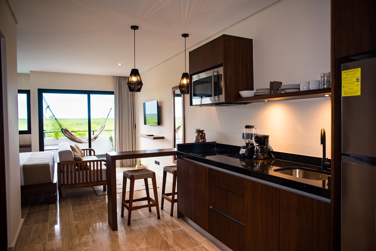 Quédate en un moderno estudio en Hama Condo Hotel, sobre el Malecón de Mahahual, a pasos de la playa, restaurantes y beach clubs. Disfruta privacidad y excelente ubicación en un solo lugar. Cuenta con terraza privada frente a los manglares, vistas al atardecer y un ambiente tranquilo. Relájate en tu plunge pool privada o en la hamaca después de un día de playa. Ideal para desconectar y disfrutar.