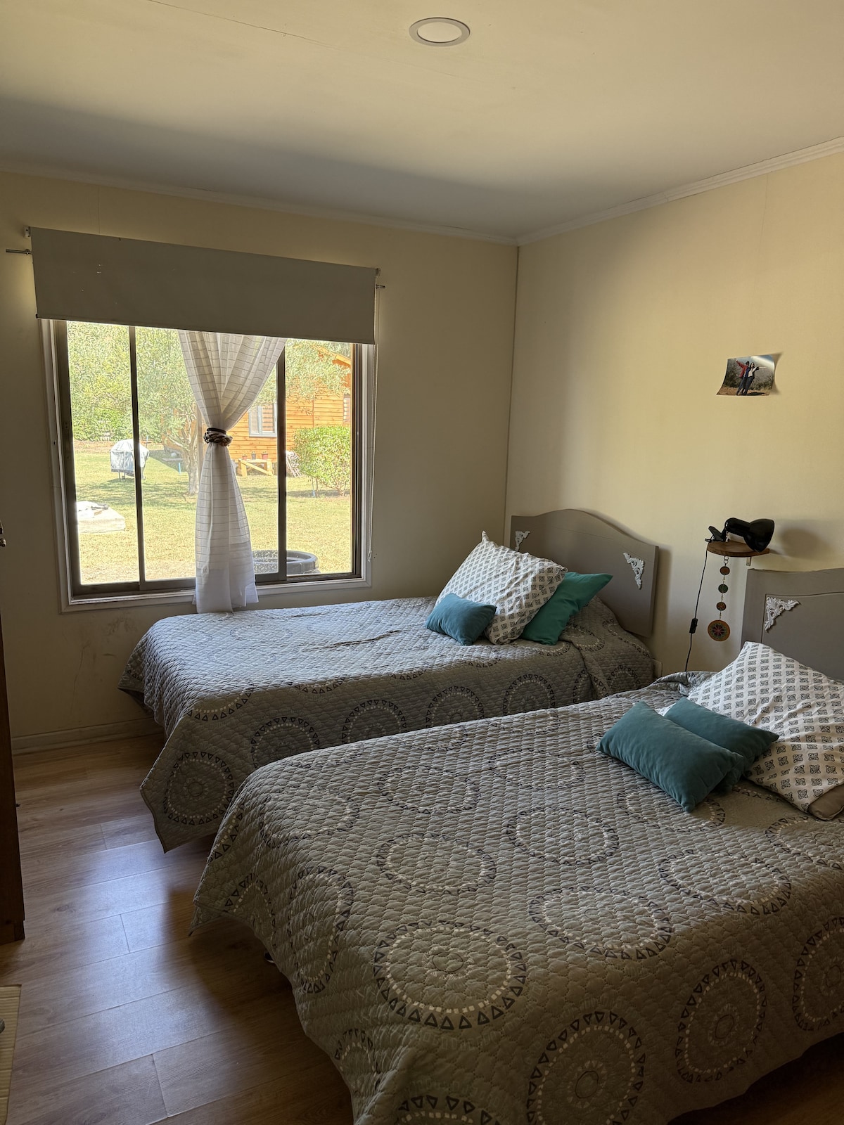 Habitación cómoda y luminosa ubicada dentro de una casa, en un entorno tranquilo y natural. Ideal para descansar, desconectarse y disfrutar de una estadía relajada. La pieza está equipada con: dos camas de plaza y media con televisión. El alojamiento cuenta con baño compartido, siempre limpio y de fácil acceso. Perfecta para parejas, amigos o viajeros que buscan comodidad y descanso en un entorno natural, con aire puro y un ambiente acogedor.*Disponible: Quincho, piscina y Uber. Se pagan aparte.