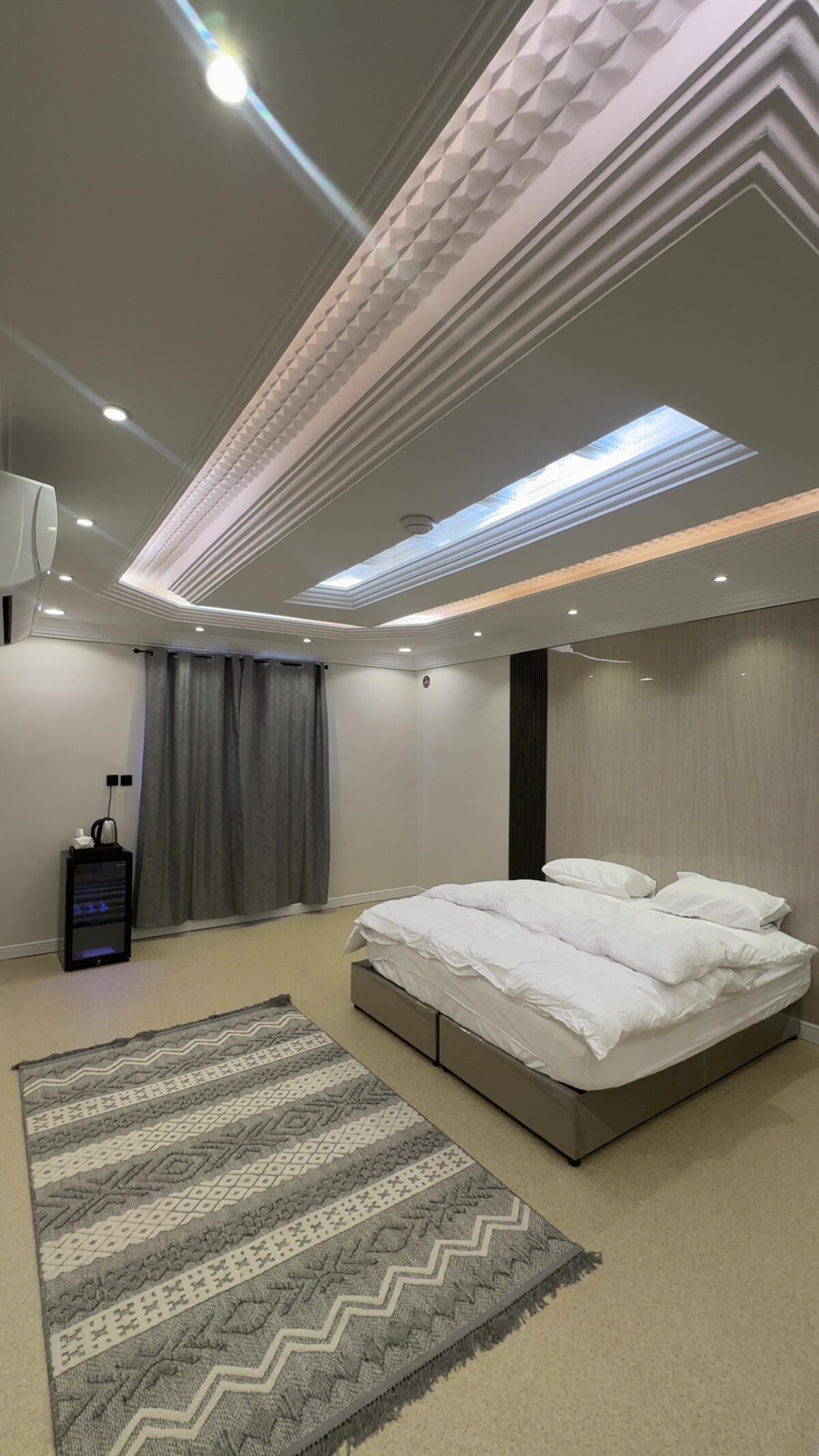 A modern studio with a refined design offering comfort and privacy, featuring smart self check-in. Includes a king-size bed, elegant seating, massage chair, full kitchen, and a luxurious bathroom with Jacuzzi. Hotel-style cleaning is available upon request. Smart use of space, stylish furniture and calming touches. Located 5 mins from Jeddah Airport. Fast Wi-Fi, 75” TV, free Netflix. Quiet building with elevator and private parking. Everything you need for a perfect stay.