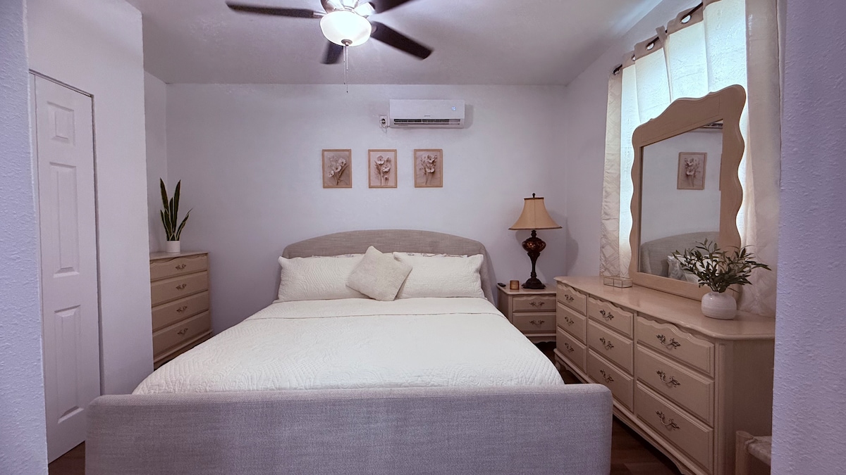Descubre comodidad y conveniencia en esta encantadora casita de dos habitaciones y un baño, perfecta para una escapada relajante o un viaje de trabajo. La casa cuenta con una sala luminosa y una cocina equipada. Disfruta de las mañanas o las tardes en el porche con asientos cómodos y plantas. Ofrecemos un cargador para–EV en el garage. Ya sea explorando las atracciones cercanas o relajándote en el interior, este retiro tranquilo ofrece todo lo necesario para un viaje memorable.