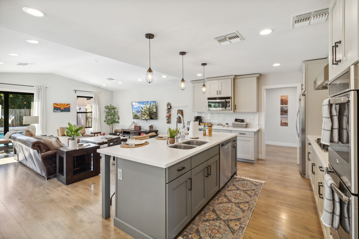 Descubre lo mejor de Maricopa desde la comodidad y conveniencia de esta casa privada de estilo resort. A pocos minutos del campo de golf, Harrah's Casino, el complejo recreativo Copper Sky o haz una excursión de un día para explorar todo lo que Phoenix, Scottsdale y Tucson tienen para ofrecer. Recientemente reformada y bellamente amueblada en todas partes, esta casa privada de tres dormitorios cuenta con una planta abierta, cocina moderna con isla, comedor, espacios de trabajo dedicados, sala de estar, televisores, internet y piscina privada.