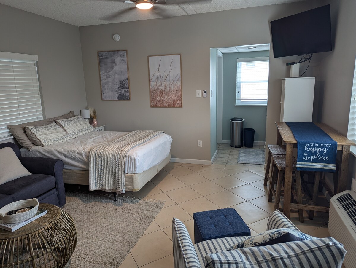 Condominio pequeño perfecto para 2 personas. - Privado, con ropa de cama, artículos de aseo básicos, Smart TV con Netflix, wifi y aire acondicionado. - Ventajas adicionales: 2 etiquetas de playa, 2 toallas de playa, 2 sillas, 1 sombrilla, café de cortesía. - La unidad 302 no tiene aparcamiento dedicado, pero hay varias opciones cerca como aparcamiento en la calle, aparcamientos a poca distancia, aparcamiento con parquímetro cerca. - Comodidades del edificio: lavandería en el lugar, ducha al aire libre. Llegada: 4:00 P. M. Salida: 11:00 A. M.