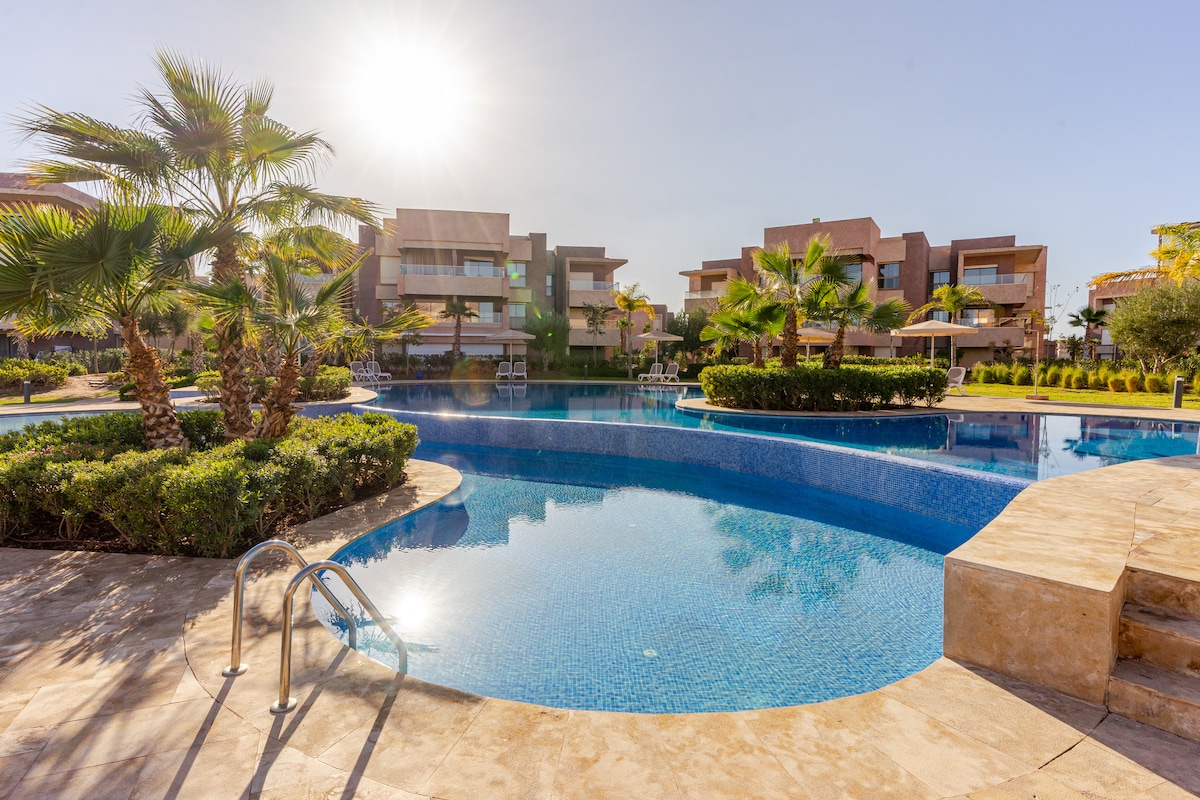 3 Bedroom stylish apartment with a swimming pool in Prestigia Golf Resort right in the city center. Niched in a perfect location, very close to the airport, and only a few minutes away from the Medina, the Mamounia and M Avenue. Enjoy large smart TV for Netflix, comfortable bedding and amazing views on the golf overlooking the Atlas Mountains. The apartment is inside a golf residence with security, a club house, swimming pools and a golf course with breathtaking views of the Atlas Mountains.