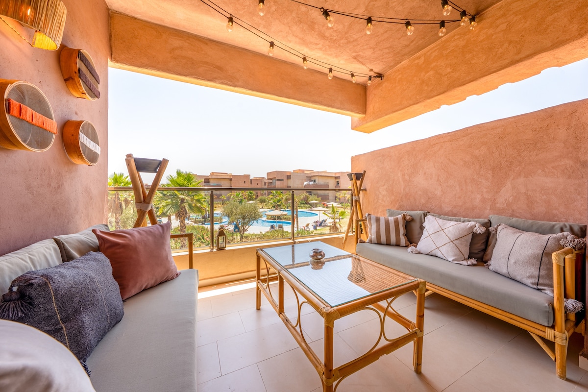 Détendez-vous dans ce logement unique et tranquille. A Prestigia Argan Golf Resort, Magnifique Appartement dans une résidence sécurisée : - Salon avec Canapé convertible, - Chambre lit double avec Tv connectée, - Deux terrasses vue piscine, - Fibre Optique 200 Mbps, idéale pour le streaming et le télétravail, - TV Smart avec IPTV et Netflix, - Cuisine équipée, - Piscine - Jardin, - Parking la piscine est ouverte à partir du mois Juin jusqu’au décembre.